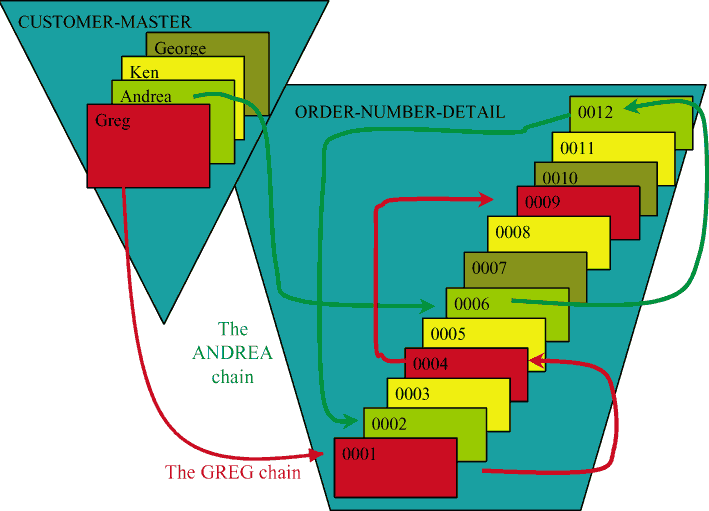 ![]() Chains of RecordsWe've been discussing the concept ofchainsof records in the last few installments of this series of articles. Figure 1 illustrates this concept in more detail than we've seen up until now. Each of the four records in CUSTOMER-MASTER is associated with a chainof related records in ORDER-NUMBER-DETAIL. For example, the GREG record in CUSTOMER-MASTER is associated with a set of records in ORDER-NUMBER-DETAIL. These records represent all of the orders Greg has placed with our company. Every time Greg calls in an order, a new record representing that order is placed in the ORDER-NUMBER DETAIL dataset. Then, the record is also added to the Greg chain. In Figure 1, we've colored all of GREG's records red, to make them easier to find. The Greg Chainis nothing more than the set of records in ORDER-NUMBER-DETAIL that correspond to GREG's orders. Every chain of records is arranged in a particular sequence or order. The GREG chain begins (or is rooted) with Greg's record in the CUSTOMER-MASTER dataset. Figure 1 represents the linkages among Greg's records using red arrows. If you follow those arrows from the GREG record in CUSTOMER-MASTER to the records in ORDER-NUMBER-DETAIL, you'll find that the GREG chain is made up of three records. They have order numbers 0001, 0004 and 0009, in that order. Note, that in Greg's case, the sequence of records in the GREG chain is the same sequence in which the records are physically stored in the database. That is, the GREG chain is made of order numbers 0001, 0004, and 0009, and the chain seems to be sorted in order number sequence. In practice, chains don't have to be sorted in any particular sequence. For example, look at the Andrea chain of records in Figure 1. The ANDREA records are all shown in green, and the arrows that show the linkages in the ANDREA chain are also green in color. Like Greg's chain, Andrea's chain is rooted in the ANDREA record in CUSTOMER-MASTER. This record contains a pointer to the corresponding chain of records in ORDER-NUMBER-DETAIL. If you follow the green arrows, you'll see that that the ANDREA chain in ORDER-NUMBER-DETAIL begins with order number 0006, continuing with 0012, and ending with 0002. As you can see, the ANDREA records are in no particular order. When this IMAGE/SQL database was first defined in a schema, the chains were also defined in that file. We began our discussion of IMAGE/SQL several months ago by showing you how to create and compile a schema. There was very little discussion of chainsat that time, so we'll review the concept now, as it applies to the schema. There are sections in every schema to define database passwords, data items, and datasets. But there is no chainssection. That's because the chains are implied by the relationships among the items in the schema. Recall that every schema contains a SETS: section in which we define the various datasets that make up the database. Then, for each dataset, the various data items (or fields, if you prefer) that make up that dataset are defined in the schema. Some of these data items are identified as search items. Each search item that is defined in the schema results in a corresponding chain of records. In our example in Figure 1, CUSTOMER-NAME is a search item. In the schema that defined this database, the CUSTOMER-MASTER and ORDER-NUMBER-DETAIL datasets were defined in the SETS portion of the schema, as shown in Figure 2. Figure 2: SETS Part of Schema